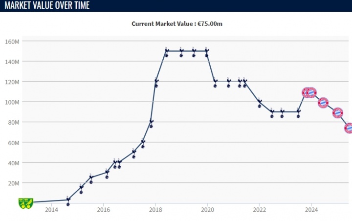凱恩職業(yè)生涯身價(jià)巔峰在2018-2019年,當(dāng)時(shí)凱恩在熱刺效力時(shí)身價(jià)一度上漲到1.5億歐元。