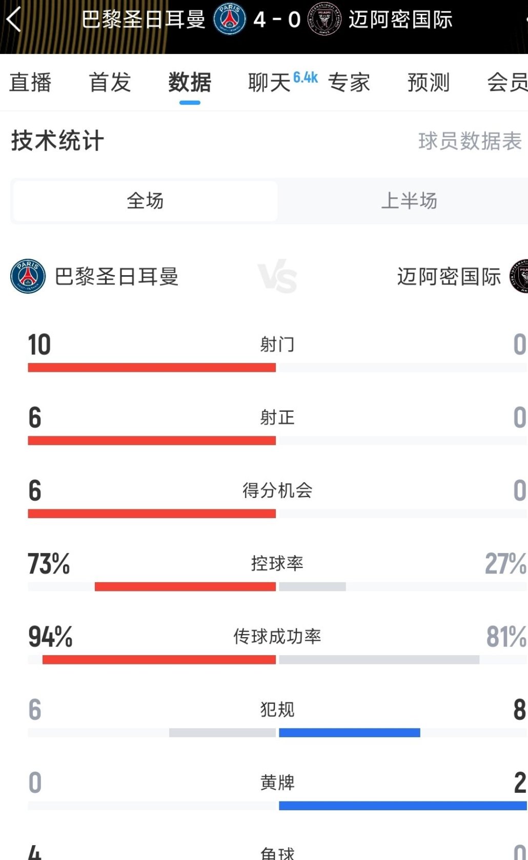 巴黎圣日耳曼vs邁阿密國(guó)際半場(chǎng)數(shù)據(jù):