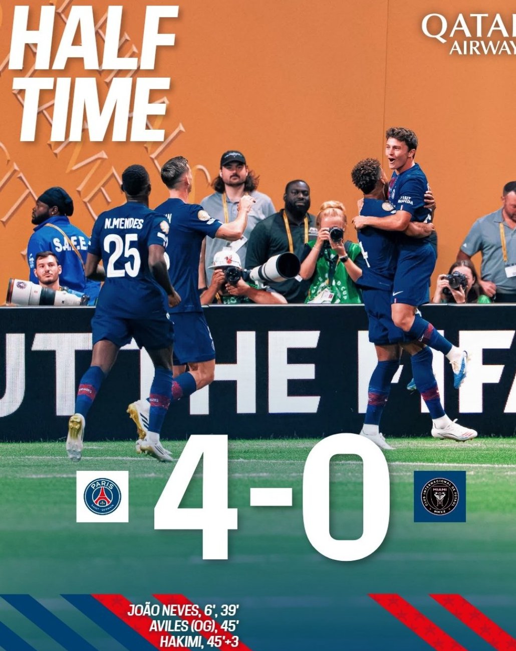 06月30日訊 世俱杯1/8決賽,巴黎圣日耳曼vs邁阿密國(guó)際。上半場(chǎng)比賽結(jié)束,巴黎4-0領(lǐng)先邁阿密。半場(chǎng)數(shù)據(jù)如圖所示。