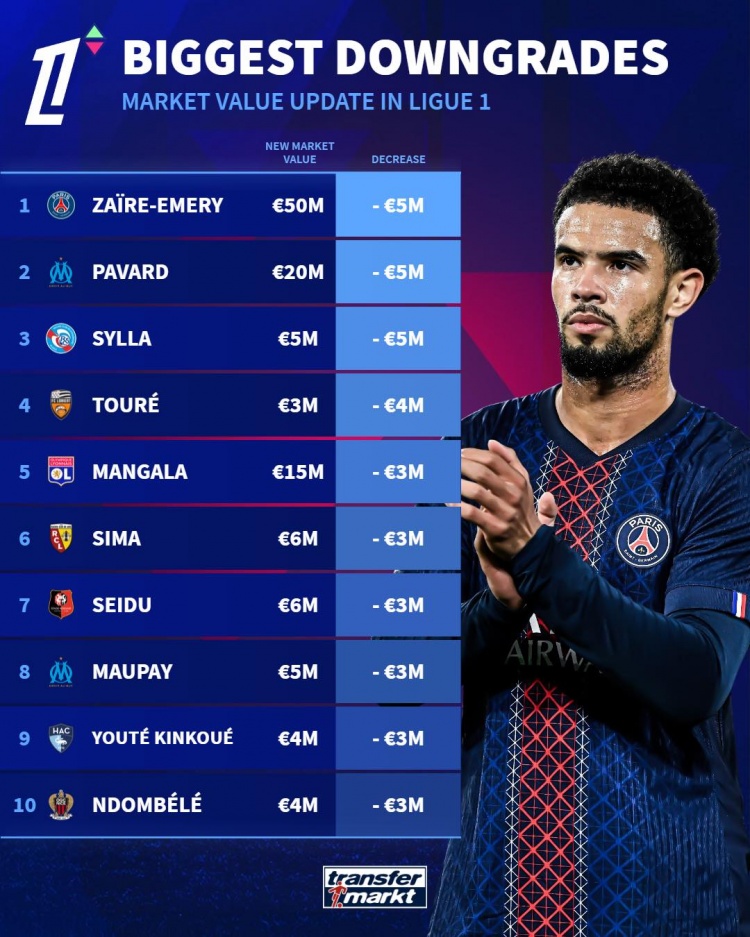 10月12日訊 德國轉會市場更新了法甲球員的身價,并列出身價下跌排名,扎伊爾-埃梅里、帕瓦爾、西拉-500萬歐居首。