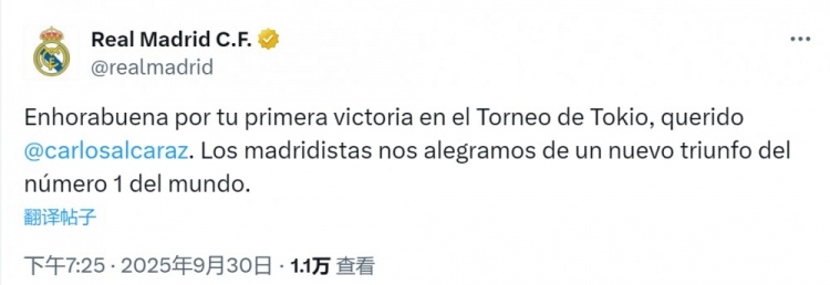 皇馬官方社媒寫道:“親愛的阿爾卡拉斯,祝賀你首次贏得ATP東京站冠軍,皇馬球迷為世界第一的又一次奪冠感到高興?!?/p>