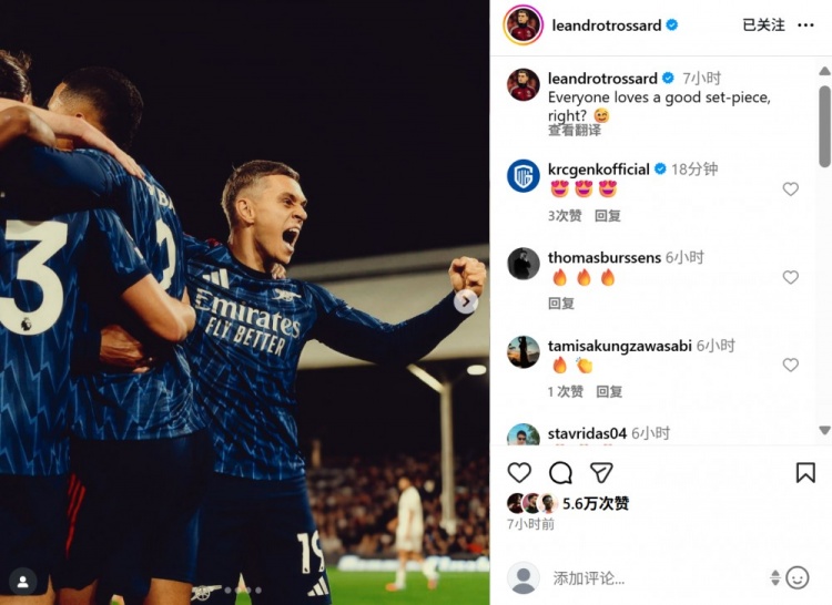 賽后特羅薩德也在個人社媒曬出慶祝進(jìn)球照片,配文寫道:“人人都愛高質(zhì)量的定位球,難道不是嗎”