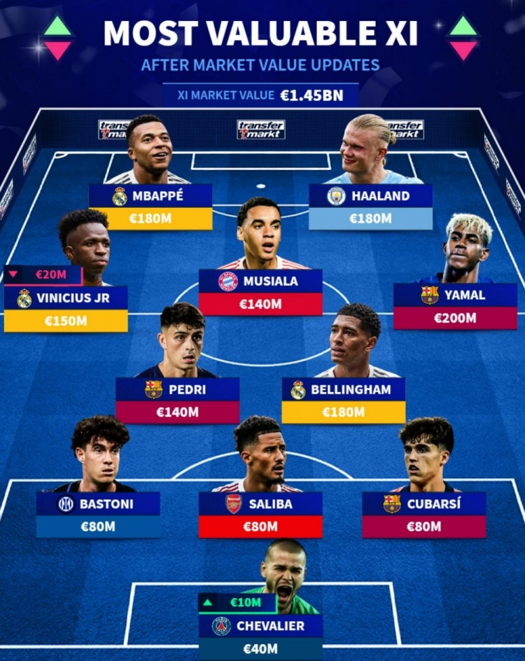 德轉(zhuǎn)列世界足壇身價(jià)最高陣:姆巴佩、哈蘭德領(lǐng)銜,亞馬爾在列