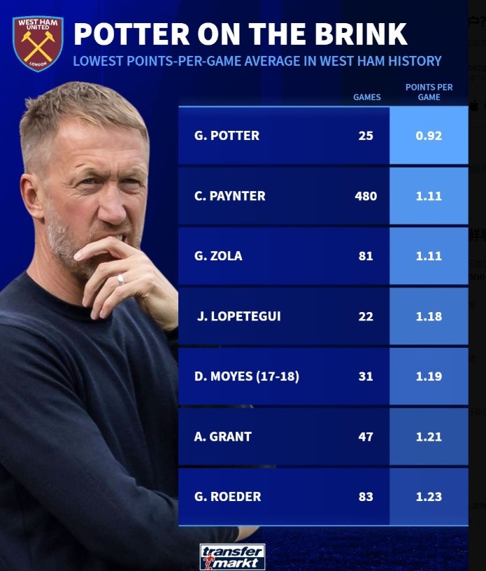 9月21日訊 英超第5輪比賽,西漢姆聯(lián)在主場以1-2的比分不敵水晶宮,格拉漢姆-波特遭遇下課危機(jī)。根據(jù)數(shù)據(jù)統(tǒng)計,波特是西漢姆聯(lián)隊史拿分率最低的主教練,場均僅能拿到0.92分。