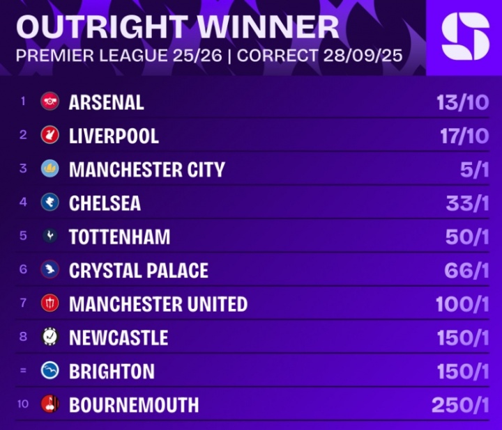 09月29日訊 本輪英超,阿森納2-1逆轉(zhuǎn)絕殺紐卡斯?fàn)柭?lián),賽后有關(guān)機(jī)構(gòu)更新了英超冠軍的賠率。