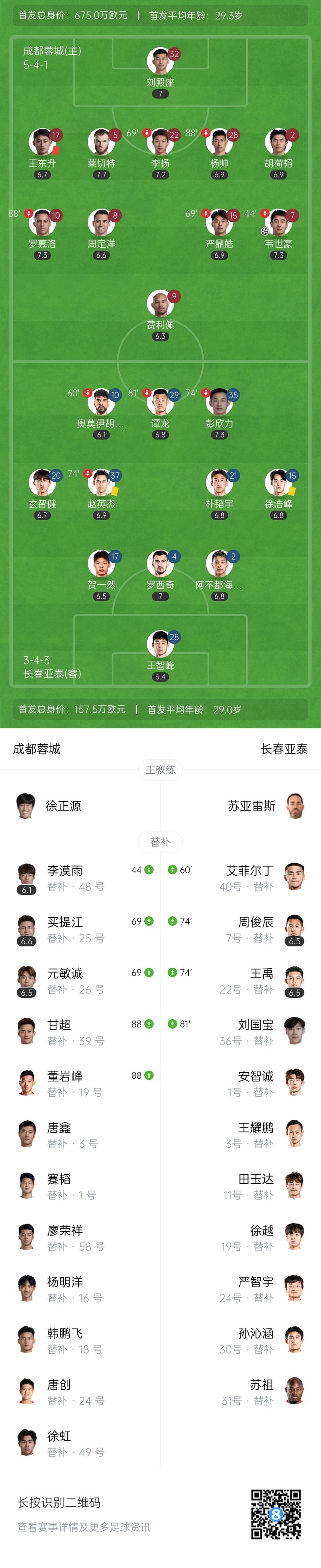 下半場補時6分鐘。最終全場比賽結束,成都蓉城1-0長春亞泰。