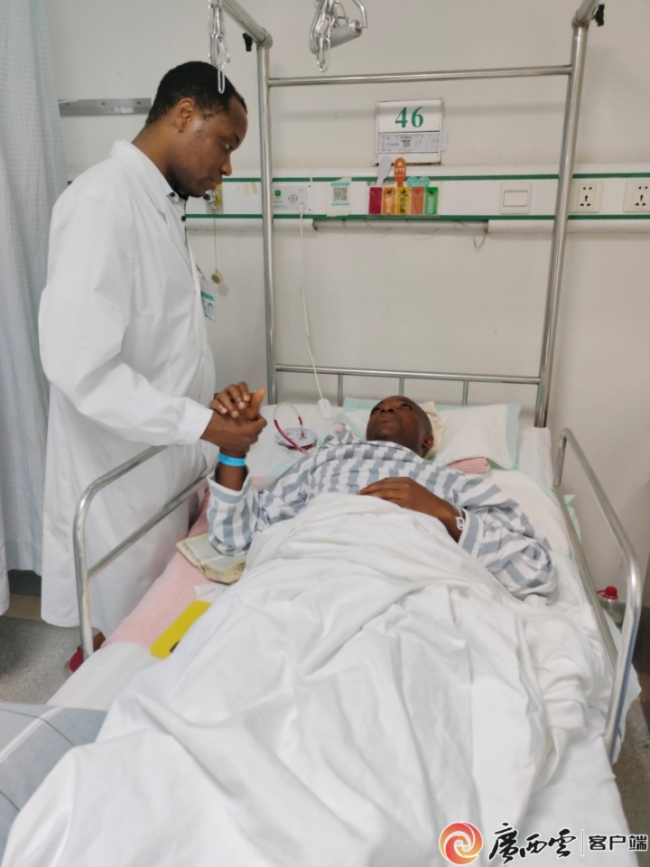 為緩解阿薩莫阿身處異國就醫(yī)的緊張情緒,主刀醫(yī)生詹新立還特意安排自己帶教的在讀博士生阿布前往病房探望。巧合的是,阿布與阿薩莫阿同為加納人?!袄相l(xiāng)見老鄉(xiāng)”的親切交流,不僅有效疏解了阿薩莫阿的不安,也讓他對后續(xù)診療更添信任感。
